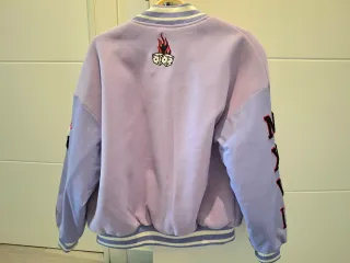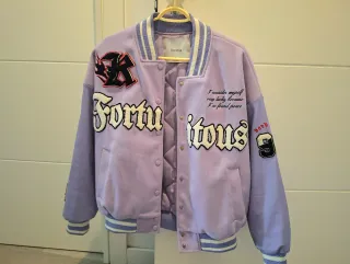 Chaqueta estilo varsity en color lila. Presenta parches bordados en la parte delantera y trasera, con detalles de texto y un número. Chaqueta lila de Bershka Solo usada un par de veces, como nueva. Talla S, pero es bastante oversize. - Diseño oversize. - Puños y cuello de canalé con rayas. - Cierre de botones a presión.