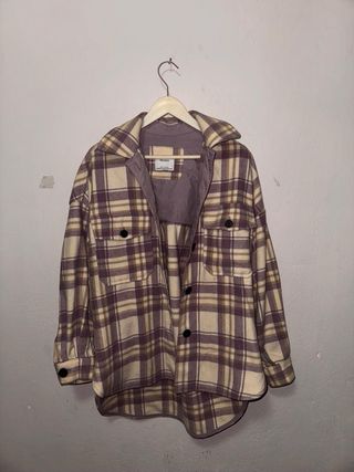 Sobrecamisa (shacket) de Bershka con estampado de cuadros en tonos lila, beige y marrón. Es una prenda ideal para el entretiempo o para llevar con un jersey debajo en invierno. Estilo oversize con hombros caídos. Tiene dos bolsillos delanteros con botón y cierre frontal de botones negros. Es una XS, pero al ser de corte amplio, también sirve perfectamente para una talla S.