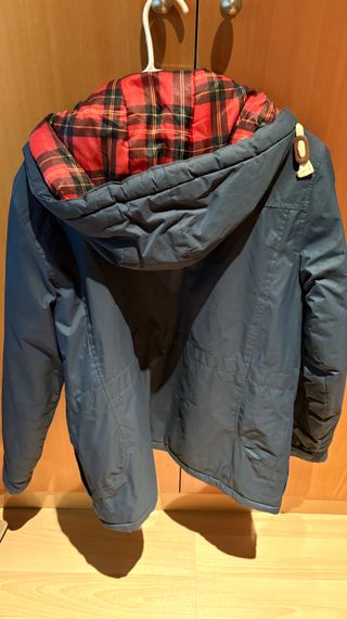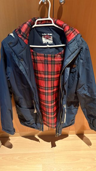 Abrigo de la marca Lee Cooper con un diseño moderno y forro a cuadros. - Color exterior azul marino. - Forro interior a cuadros en rojo y negro. - Cierre de cremallera y botones. - Capucha integrada.
