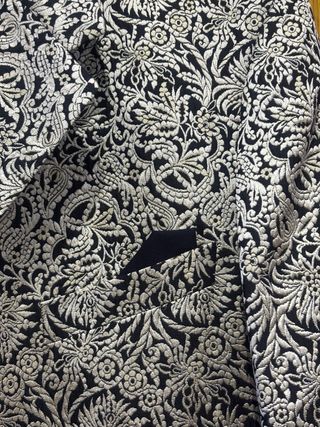 Chaqueta larga para hombre con un diseño llamativo y elegante. - Estampado detallado en tonos dorados y negros. - Corte largo y estructurado. - Cierre frontal con botones. - Bolsillos frontales. - Bolsillo de pecho. - Forro interior.