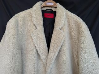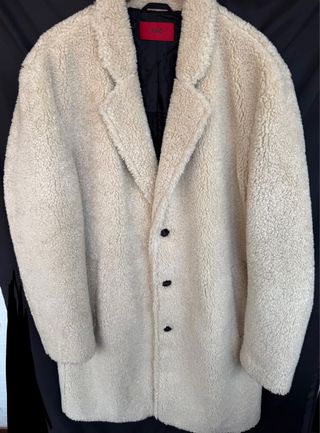 Abrigo de poliéster de color crema. Hombro a hombro 50cm Axila a axila 60cm Largo desde cuello 110cm Largo manga 64cm - Diseño de pelo. - Cierre de botones. - Cuello solapa.