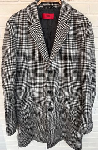Elegante abrigo de lana con un diseño Jacquard. Hombro a hombro 46cm Axila a axila 56cm Largo desde cuello 108cm Largo manga 66cm - Patrón de cuadros clásico. - Cierre de botones. - Bolsillos frontales.