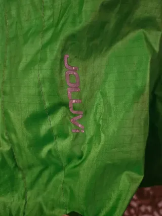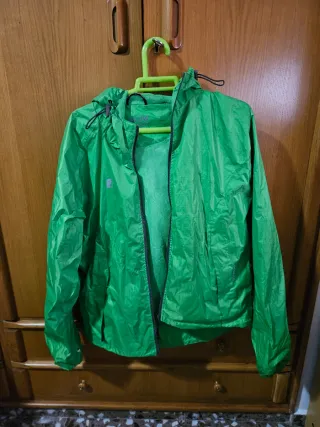 Chaqueta impermeable de la marca Joluvi en color verde. - Diseño ligero y práctico. - Capucha ajustable con cordón. - Cierre de cremallera frontal. Solo tiene roto lo que se ve en la manga