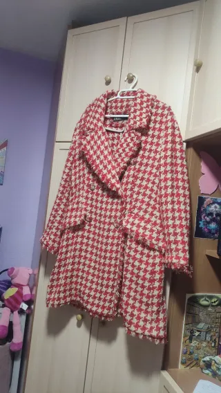 Chaquetón con un diseño de pata de gallo en tonos rojos y beige, y estilo Channel. Presenta un acabado deshilachado en los bordes. Medidas:largo:86/87cm, axila a axila:53cm estirado y sin estirar 49cm, de hombro de largo:54cm. - Diseño de pata de gallo. - Acabado deshilachado.
