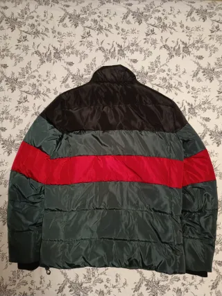 Chaqueta Plumas Hombre Moncler Talla S. Es negra con las mangas de punto y con una banda multicolor en rojo, azul y blanco en el frente. Mide 56 cms de axila a axila. Ver fotos. Muy bonita!!