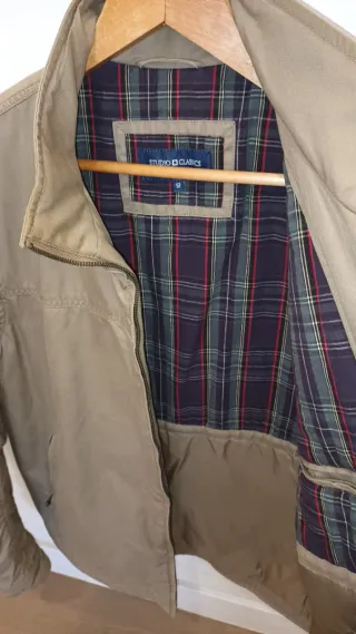 Chaqueta de la marca Studio Clasic, talla 52. - Diseño clásico y versátil. - forro de cuadros. - Cierre de cremallera frontal. - Bolsillos laterales e interiores - exterior 100% algodón. - lavable en lavadora.