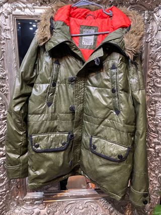 Chaqueta de invierno para hombre con capucha de pelo. - Cierre de cremallera y botones. - Bolsillos frontales con solapa. - Bolsillos con cremallera en el pecho. - Puños ajustables. Usado muy poco