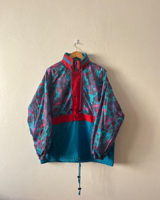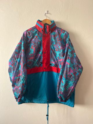 Chaqueta cortavientos vintage auténtica, con un diseño muy llamativo y colorido que destaca por su estampado geométrico en tonos azul, turquesa, rosa y rojo. Estilo retro años 80/90, ideal para outfits streetwear o looks casuales con personalidad. Tejido ligero y resistente, cómoda y funcional. Cuenta con cierre de cremallera y botones a presión, cuello alto y cordón ajustable en la parte inferior. Prenda original, perfecta para quienes buscan ropa diferente y con carácter. Estado: muy bueno Talla: L #vintage #vintagejacket #chaquetavintage #cortavientos #windbreaker #retro #retrostyle #90sstyle #80sstyle #streetwear