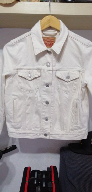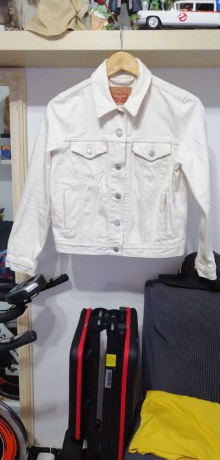 vendo Chaqueta vaquera clásica de Levi's en color blanco crema. Un básico atemporal para cualquier armario es la talla S y esta en muy buen estado. - Cierre de botones metálicos. - Dos bolsillos en el pecho con solapa. - Cuello camisero. - Puños abotonados.