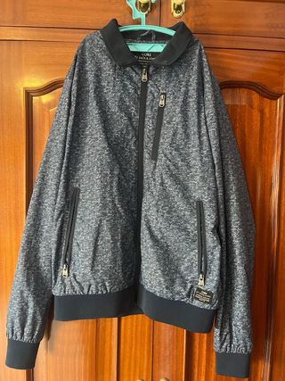 Chaqueta de hombre con forro interior a cuadros. Usado dos veces. - Cierre de cremallera. - Bolsillos frontales con botón. - Puños elásticos. - Capucha.