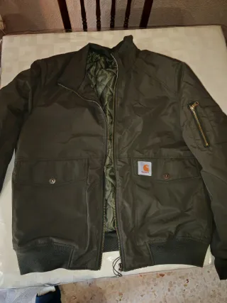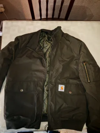Chaqueta estilo bomber aviador de la marca Carhartt. - Color verde oliva. - Diseño acolchado en el interior. - Bolsillos frontales con botón. - Bolsillo con cremallera en la manga. Chaqueta acolchada con bolsillo interior y exterior carhartt. Boxy fit. Nueva