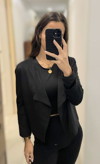 Torera de ante con un diseño elegante. - Material: Terciopelo. - Color: Negro. - Nueva. Usada una vez. - Muy bien conservada. No muestra signos de desgaste, ni desperfectos. - Muy cómoda, ligera, práctica tanto para invierno como primavera. **Medidas** Ancho(Hombros): 40cm Largo: 44cm
