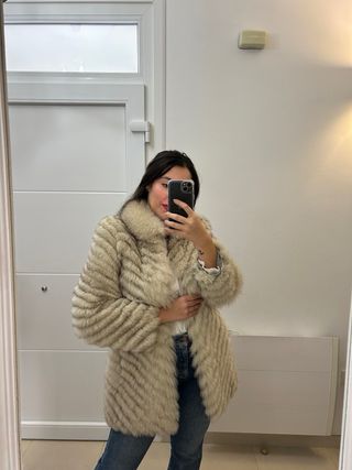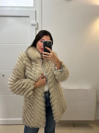 Talla S-M. Es estrecho de espalda, de hombro. No lo recomiendo para más talla. Máximo una M. Ideal para S o incluso XS. En muy buen estado, apenas usado. Pelaje de gran calidad. Las fotos 6 y 7 son de otro abrigo. Las pongo para que se pueda ver el efecto de como puede quedar cortando el bajo.