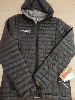 Chaqueta acolchada con capucha de la marca italiana de montaña Rock Experience de hombre talla S de hombre. Exterior en color negro caviar e interior de color gris. Tejido exterior nailon ultraligero micro-ripstop de 10 Deniers con tratamiento DWR de repelencia al agua. Relleno sintético Dupont Sorona. Dos bolsillos para manos con cremallera. La chaqueta se puede empaquetar en el bolsillo izquierdo. Cinta elástica en el borde de las mangas y en la capucha. Nueva, con etiquetas, a estrenar. Importante: es una chaqueta ligera (no para condiciones de mucho frío), ideal para llevar en la mochila o en una maleta de equipaje de mano.
