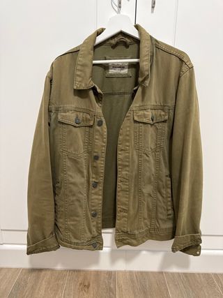 Chaqueta estilo vaquera de la marca Pull&Bear. Un básico para tu armario. - Color caqui/verde oliva. - Cierre de botones. - Dos bolsillos en el pecho y en laterales. - Pequeña mancha rojiza en cuello (apenas apreciable)