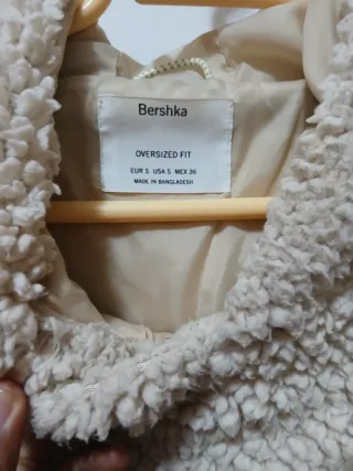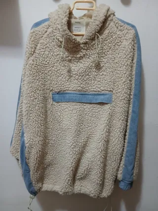 Abrigo de Bershka con un diseño moderno y cálido. - Tejido principal de borreguito en color beige. - Detalles en tela vaquera azul en los laterales y bolsillo. - Capucha con cordones ajustables. - Bolsillo canguro en la parte frontal.