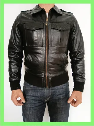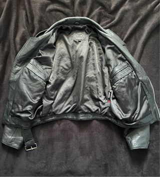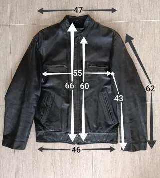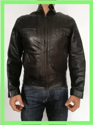 Más prendas de cuero en mi perfil. Usada, pero en perfecto estado exterior. Forro de algodón con un agujero ya zurcido en el cuello casi invisible; una zona rota ya zurcida junto al bolsillo, poco notoria; se han desprendido unos hilos del bolsillo interior, ya cosidos, se nota muy poco. Cuero ovino adulto de excelente calidad, muy resistente. Grosor medio-grueso. Textura lisa y brillante. Color negro intenso. Talla L de talle corto, también perfectamente válida para una M si se quiere llevar holgada. El modelo mide 1 74 y pesa 82 kgs. Medidas indicadas en las fotos. Preguntar cualquier información sin compromiso.