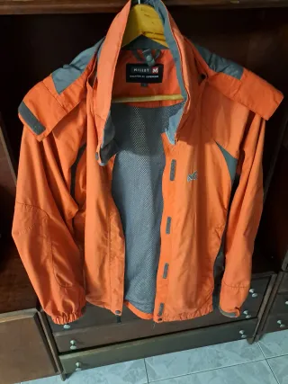Chaqueta cortavientos de la marca Millet, ideal para actividades al aire libre. Su diseño combina tonos naranjas y grises para un estilo deportivo. - Cierre frontal con botones a presión. - Forro interior de malla transpirable. - Puños ajustables con velcro. - Capucha integrada.