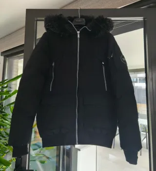 Cazadora de la marca Schott en color azul marino súper chula, como nueva, con capucha, cintura ajustable, valdría como Talla S. - Diseño moderno con cuello alto. - Cierre de cremallera frontal. - Múltiples bolsillos con cremallera. - Detalle de logo en la manga.
