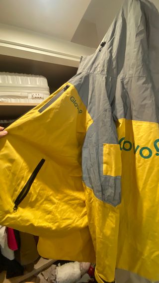 Chaqueta de la marca Glovo, con un diseño bicolor. - Parte superior en gris. - Parte inferior en amarillo. - Cierre con cremallera. - La chaqueta es reflectante.