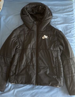 Abrigo Nike negro con capucha, perfecto para mantenerte abrigado. - Diseño acolchado. - Cierre de cremallera frontal. - Bolsillos laterales con cremallera.