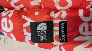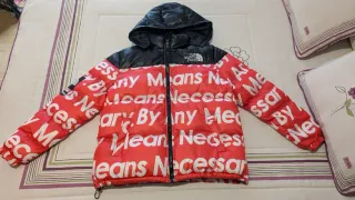 Abrigo acolchado con capucha colaboración de The North Face y supreme. Presenta un diseño llamativo con el logo de la marca repetido en toda la prenda. - Diseño con logo Means Necessary en blanco sobre fondo rojo. - Capucha y parte superior delantera en color negro. Por el precio se indica que no es el original obviamente. Es una talla l, pero talla como M.