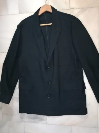Elegante abrigo de paño de Zara para hombre. - Color azul marino. - Diseño clásico con solapas. - Dos bolsillos frontales. - Cierre de botón.
