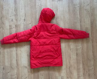 Abrigo acolchado de Adidas con capucha, perfecto para mantener el calor. Es talla XL de niño pero da bastante talla equivale a una M/L de adulto - Diseño bicolor en rojo y negro. - Cierre de cremallera frontal. - Bolsillos laterales.