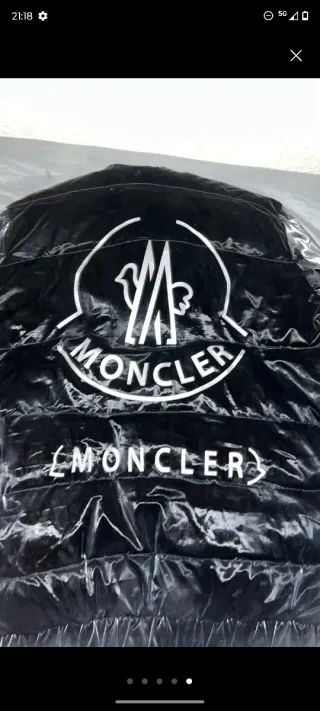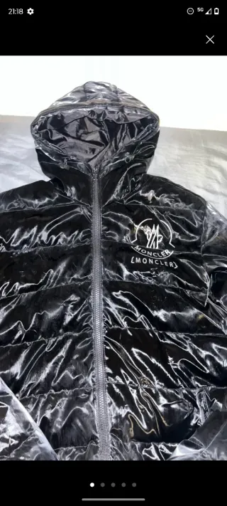 Abrigo acolchado Moncler con acabado brillante. - Diseño moderno y llamativo. - Cremallera frontal. - Logo Moncler en el pecho. Talla XL (talla más pequeño de lo normal)