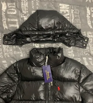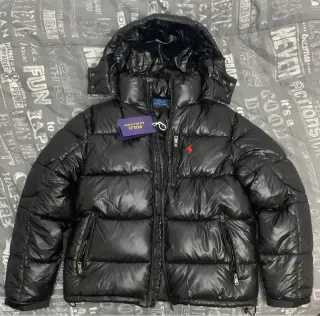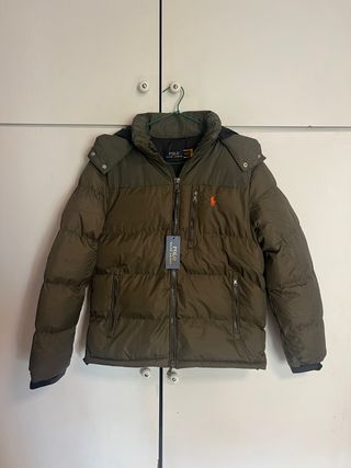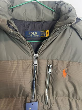 Abrigo acolchado de la marca Polo Ralph Lauren en tonos verdes y oliva. Presenta un diseño moderno y funcional. - Logo de la marca en naranja en el pecho. - Capucha integrada. - Cierre de cremallera frontal. - Bolsillos laterales con cremallera.