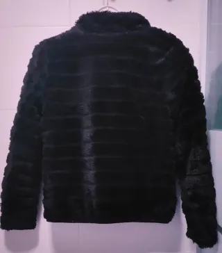 Precioso abrigo reversible de pelo sintético para mujer, color negro. Diseño de surcos horizontales, cierre de cremallera frontal, bolsillos laterales con cremallera. Es reversible: por un lado es de pelo sintético, por el otro es acolchado de tela lisa color negro. Perfecto para el invierno, muy abrigado y confortable. Talla S Marca: Dorado - Diseño moderno y versátil. - Tejido suave y muy confortable. Medidas: Ancho de hombros: 41 cm Largo: 64 cm Composición: nylon y poliéster. Único defecto: a la cremallera frontal le falta el tirador de metal. No obstante, la cremallera funciona bien. #abrigos #invierno .