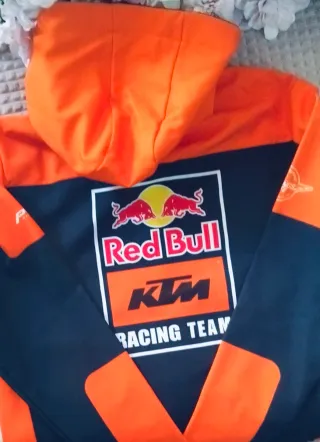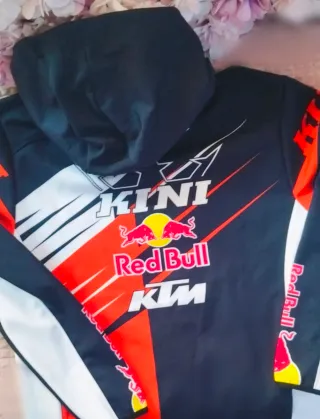 Chaqueta con diseño deportivo y llamativo. - Combinación de colores negro y naranja. - Logos de KTM y Red Bull. - Cierre de cremallera frontal. - Capucha integrada.