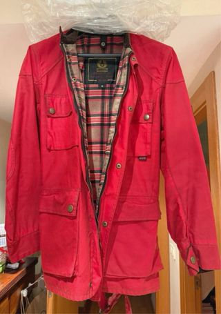 Chaqueta de la marca Belstaff en color rojo y talla M. Un clásico con un diseño atemporal. - Cuatro bolsillos frontales con cierre de botón. - Cierre principal de cremallera y botones. - Cuello alto con correa. - Puños ajustables con botón.