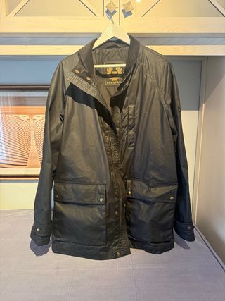 Chaqueta de la marca Belstaff en color negro. - Cierre de cremallera. - Bolsillos frontales con solapa. - Cuello alto con cierre de botón. - Puños ajustables con botón.