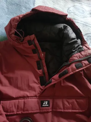Abrigo impermeable de la marca Pull&Bear. - Diseño moderno y funcional. - Cierre con cremallera y solapa. - Bolsillo frontal con logo. - Capucha ajustable.