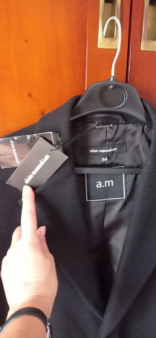 Elegante abrigo recto de corte clásico de la prestigiosa firma francesa Alain Manoukain, nuevo sin usar. Color negro, 60 % lana, talla 54, equivalente a una talla L de hombre. Tiene un diseño y una confección impecables, porque es una firma de alta costura, y está perfectamente forrado (el forro lleva grabado el nombre de la firma), disponiendo de dos bolsillos exteriores y tres interiores que cierran con cremalleras y uno con botón. En la etiqueta lleva botones de repuesto. Es una verdadera ganga, dado el precio de los artículos de esta marca.