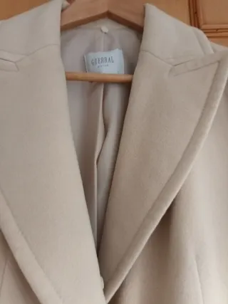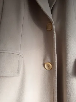 Abrigo largo de mujer.Bolsillos con tapete,70 por ciento lana virgen,10 por ciento Kashmir y 20 por ciento poliamida.Ancho hombros 40 cmts.,largo abrigo 110 cmts. - Color beige. - Cierre con botones.