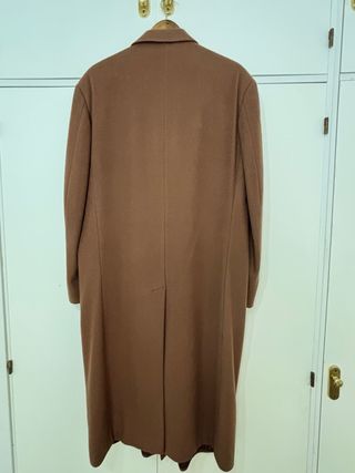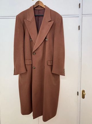 Abrigo Hombre Cacharel, confeccionado en 100% cashmere, fabricado en Italia, en los años 90. Modelo clásico de corte elegante, cruzado (doble botonadura), con solapas amplias y caída recta. Tejido de altísima calidad, suave y con cuerpo, típico de la sastrería italiana de esa época. Color marrón cálido, muy versátil y atemporal. El abrigo se encuentra en muy buen estado, sin desgastes visibles, manchas ni defectos. Conserva perfectamente su forma y estructura. Es una pieza ideal tanto para uso formal como para looks más modernos con estilo vintage o clásico. • Marca: Cacharel • Origen: Hecho en Italia • Material 100% Cashemere