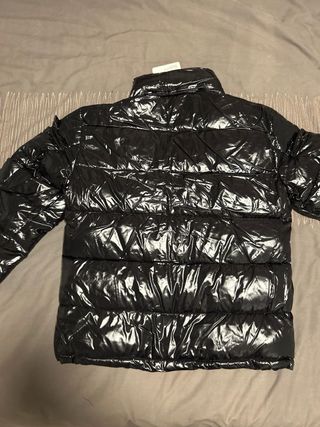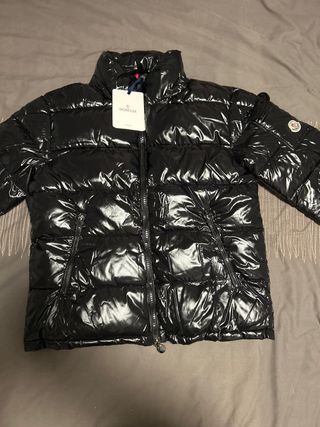 Abrigo Moncler de color negro con acabado brillante. - Diseño acolchado. - Cremallera frontal. - Cuello alto. - Logo de la marca en la manga.