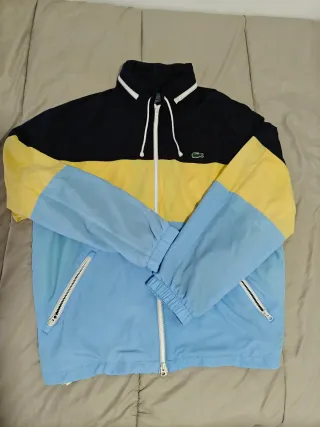 Chaqueta deportiva Lacoste con un diseño moderno y llamativo. - Diseño color block con paneles en azul marino, amarillo y azul claro. - Cuello alto con cordones. - Cremallera frontal. - Bolsillos laterales con cremallera.