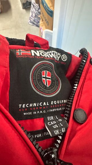 Abrigo Geographical Norway de color rojo y talla L. Diseño moderno y funcional. - Cierre de cremallera. - Bolsillo frontal con solapa. - Capucha ajustable. - Puños con Velcro. - Cordón ajustable en la cintura.