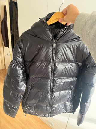 Abrigo negro con diseño acolchado y capucha. - Cierre de cremallera. - Bolsillos laterales. - Mangas largas. -Tiene un pequeño roce en una manga.