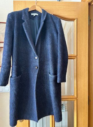 Elegante abrigo de Pedro del Hierro en talla M. Su diseño moderno y el tejido le dan un toque especial. - Tejido con textura y acabado de pelo. - Cierre con dos corchetes y aguja de adorno -2 bolsillos delanteros - medida largo 100cm -medida de sisa 56cm