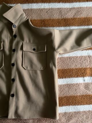 Chaqueta de estilo camisero en color beige/camel - Cierre de botones. - Dos bolsillos en el pecho con solapa. - Cuello camisero. -Está prácticamente nueva se le ha dado muy poco uso porque me queda pequeña -La talla como tal es una M pero se adapta mucho más a una S, ya que queda algo ajustada.