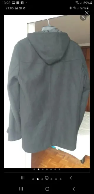 Abrigo de lana azul, con interior a cuadros. Con gorro. Talla L. Muy poco uso.