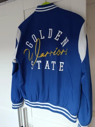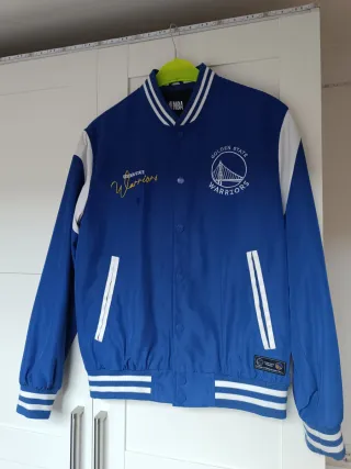 Chaqueta estilo universitario de los Golden State Warriors. - Diseño con el logo del equipo. - Cuello y puños con detalles de rayas blancas. - Cierre de botones a presión.