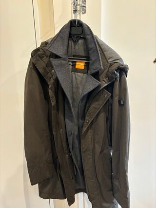 Abrigo de la marca Hugo Boss en color marrón con chaleco gris extraible.