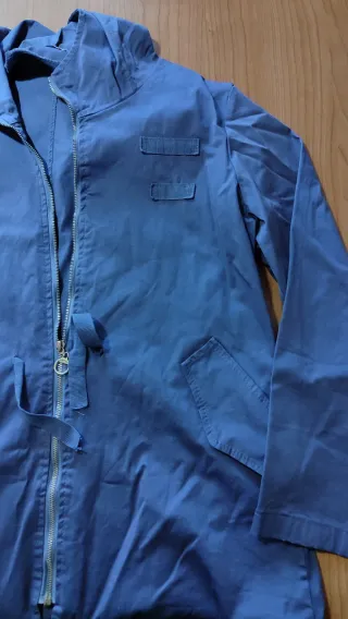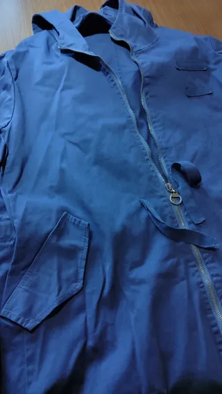 Abrigo estilo trench en color azul, fino con cordón tanto a la cintura como a la cadera para ajustar a la forma del cuerpo. Es más bien fina, con cremallera y capucha. Sus medidas son: Pecho (de axilas): 57cm Cintura: 50cm Cadera: 55cm Alto (de hombro a final de prenda): 76cm Manga (de muñeca a hombro): 58cm Espalda (de hombros): 45cm
