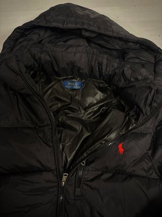Abrigo acolchado de Ralph Lauren en color negro. Cuenta con capucha y cierre de cremallera. - Logo de la marca bordado en rojo en el pecho. - Bolsillos frontales con cremallera. - Puños ajustables.