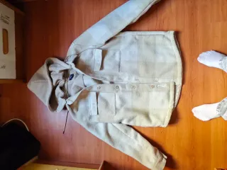 Equivale a talla M, el cuello se quita con botónes y capucha con cremallera Tiene una pequeña manchita en un hombro que apenas se nota la verdad